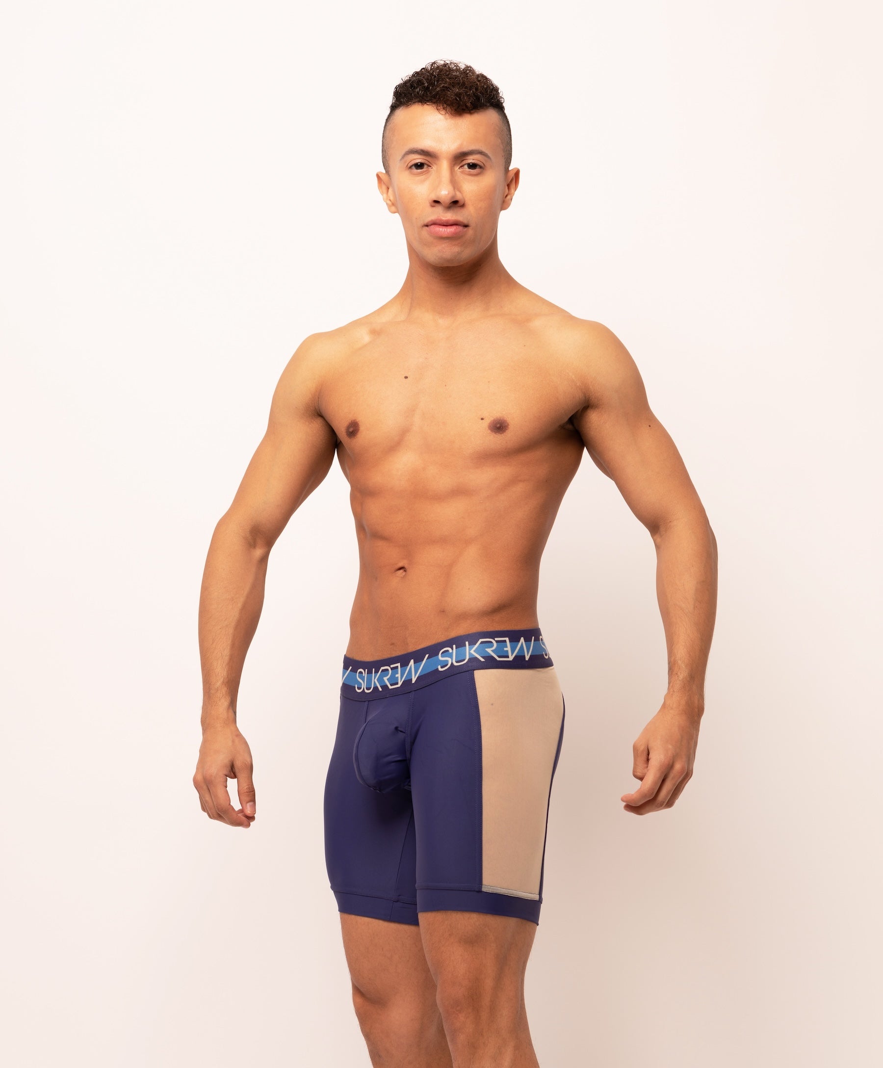 Long underwear with the look of a cycle short. Soft and flexible leg opening. Large, contoured pouch. Unlined for extra stretch and sheer mesh side panels.